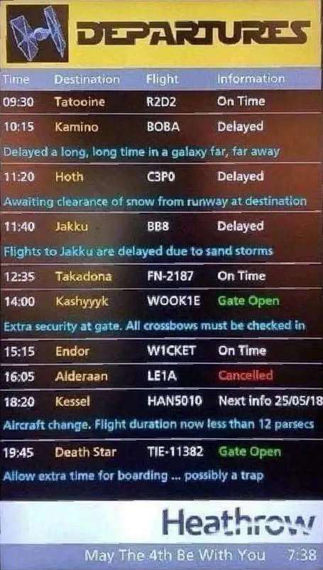 May the Fourth Be With Youmaj 4, 2025 1 min czytania Sama PrawdaDziś czwarty maja. Dzień Gwiezdnych Wojen.Obrazek ponoć z lotniska Heathrow.Sci-FiWojciech Myszkadr inż. adiunktTak się tylko rozglądam…